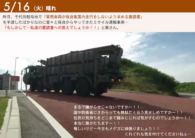 ■5月16日(火) 「軍用車両が保良集落内走行をしないよう求める要請書」を手渡した翌日、ミサイル運搬車両が保良集落内を堂々と走行。