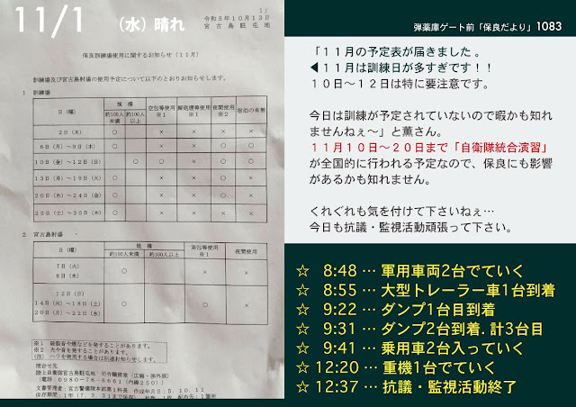 ■11月 1日他 住民の抗議を完全に無視して、今月も多数の軍用車両(ミサイル車両、大型トラック、)が保良集落内を走行。(自衛隊による警察への通報はなくなった?)