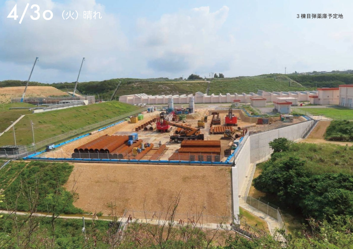 3棟目弾薬庫予定地:たくさんの資材が運び込まれ、パイル打ち込みなどが進む