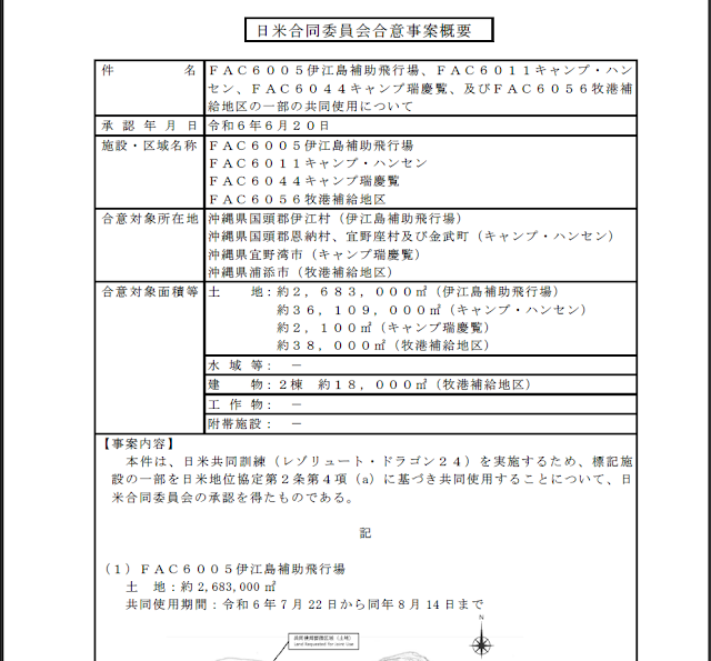 ※「レゾリュート・ドラゴン24」と称する米海兵隊と陸上自衛隊の軍事訓練:7月28日(日)~8月7日(水)、山口県、熊本県、大分県、佐賀県、沖縄県で実施予定。