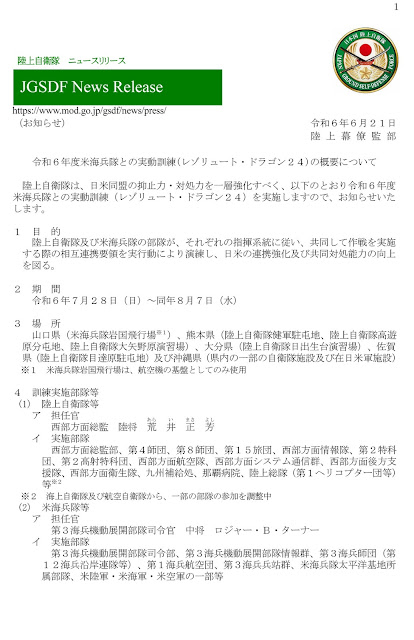 (※ さらに米陸軍から〝マルチドメインタスクフォース〟が参加。米海兵隊+米陸軍+陸自の新編成された部隊による作戦態勢の具現化)(一方、7月18日〜26日、陸自と米陸軍による共同訓練「オリエント・シールド24」が北海道…矢臼別演習場、計根別着陸場、滋賀県…饗庭野演習場、兵庫県…伊丹駐屯地、三重県…明野駐屯地で行われている。)